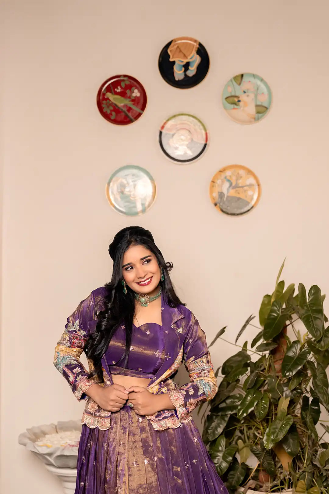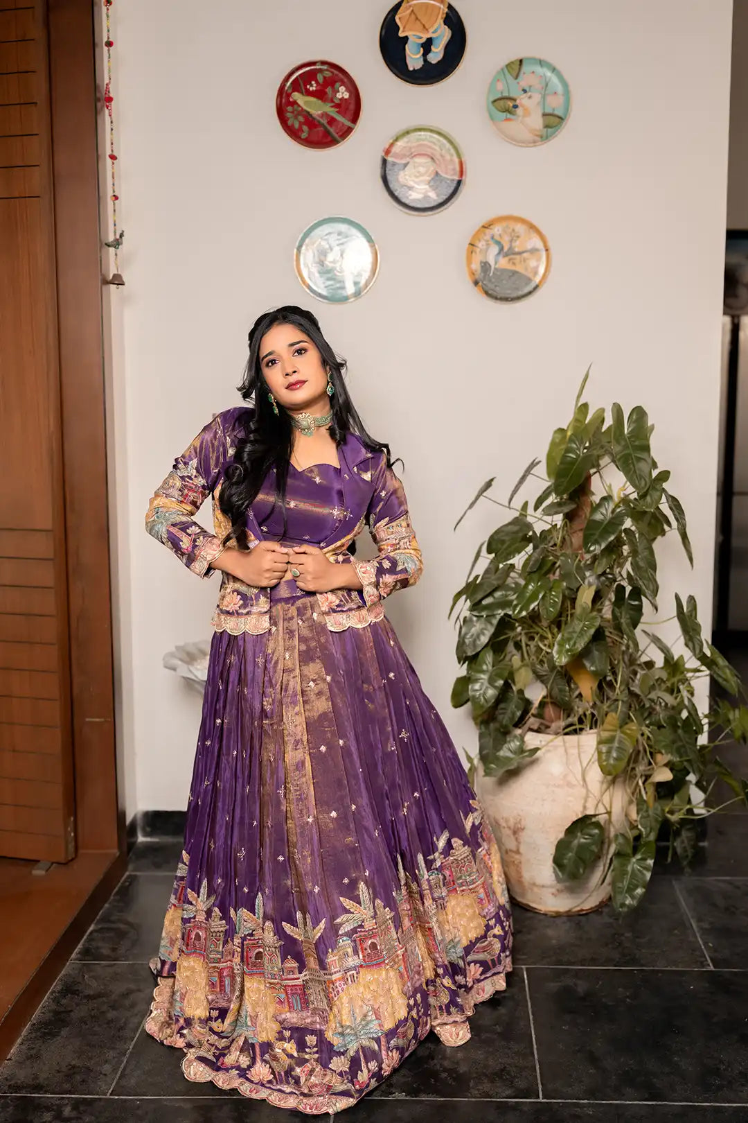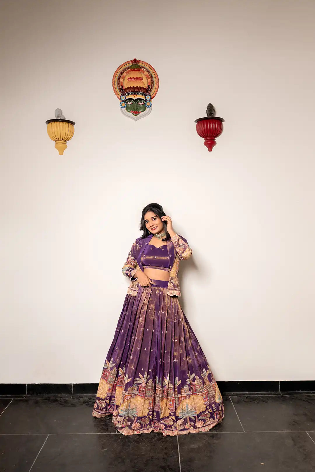 The flowy lehenga paired with a stylish embroidered coat creates a modern yet traditional silhouette — perfect for pre-wedding functions where you want comfort, grace, and standout style.