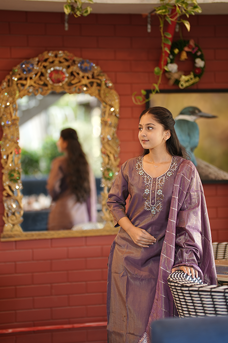 This elegant kurti set is crafted from premium tissue fabric, known for its lightweight feel and subtle sheen. Designed with intricate machine embroidery, it adds a refined and graceful touch to the ensemble.