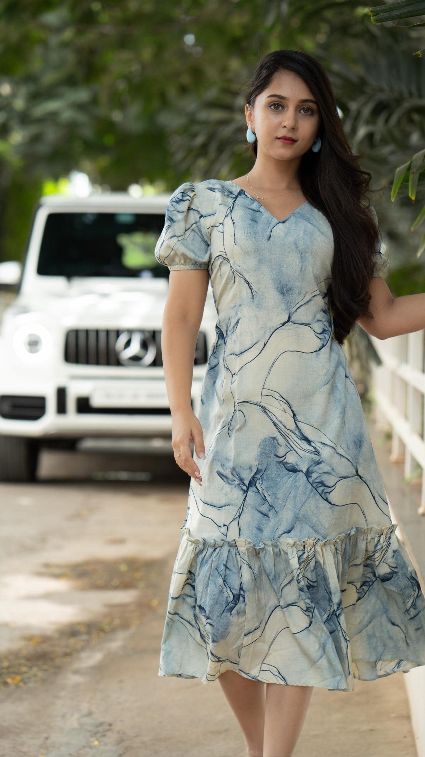 This stylish dress features a unique blue and white abstract print, a flattering V-neckline, and chic puff sleeves. With a midi-length ruffled hem, it’s perfect for casual and semi-formal occasions. Made from lightweight fabric, it ensures comfort with effortless elegance.