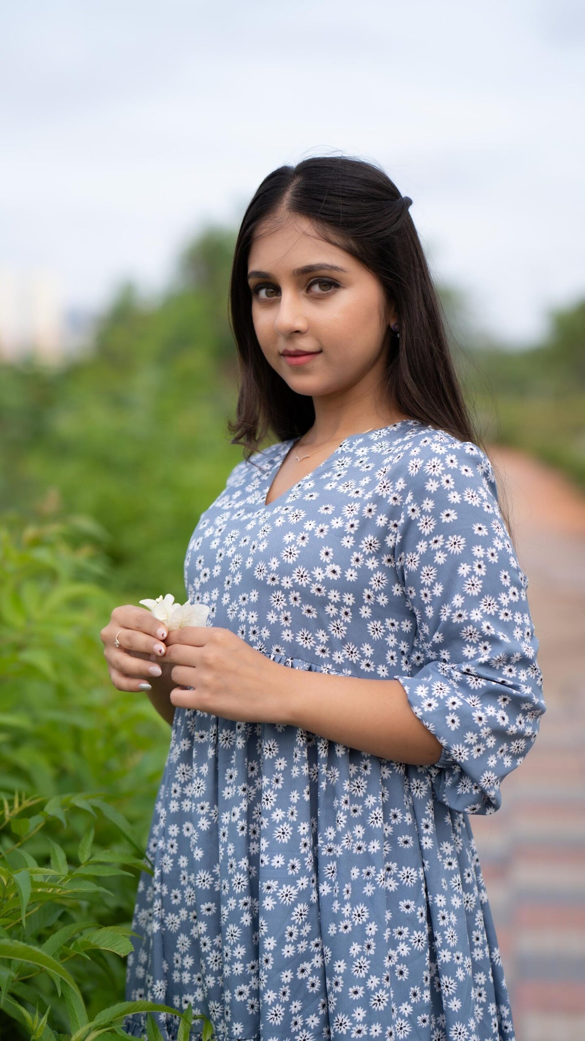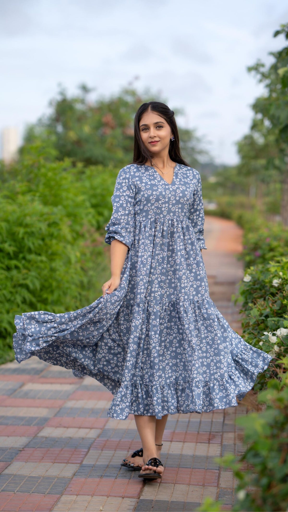 This elegant blue dress showcases a delicate floral pattern and a tiered design for a soft, feminine appeal. Featuring a flattering V-neckline and three-quarter sleeves, it offers both style and comfort. Crafted from lightweight fabric, it ensures ease of movement, making it perfect for casual outings and relaxed events.