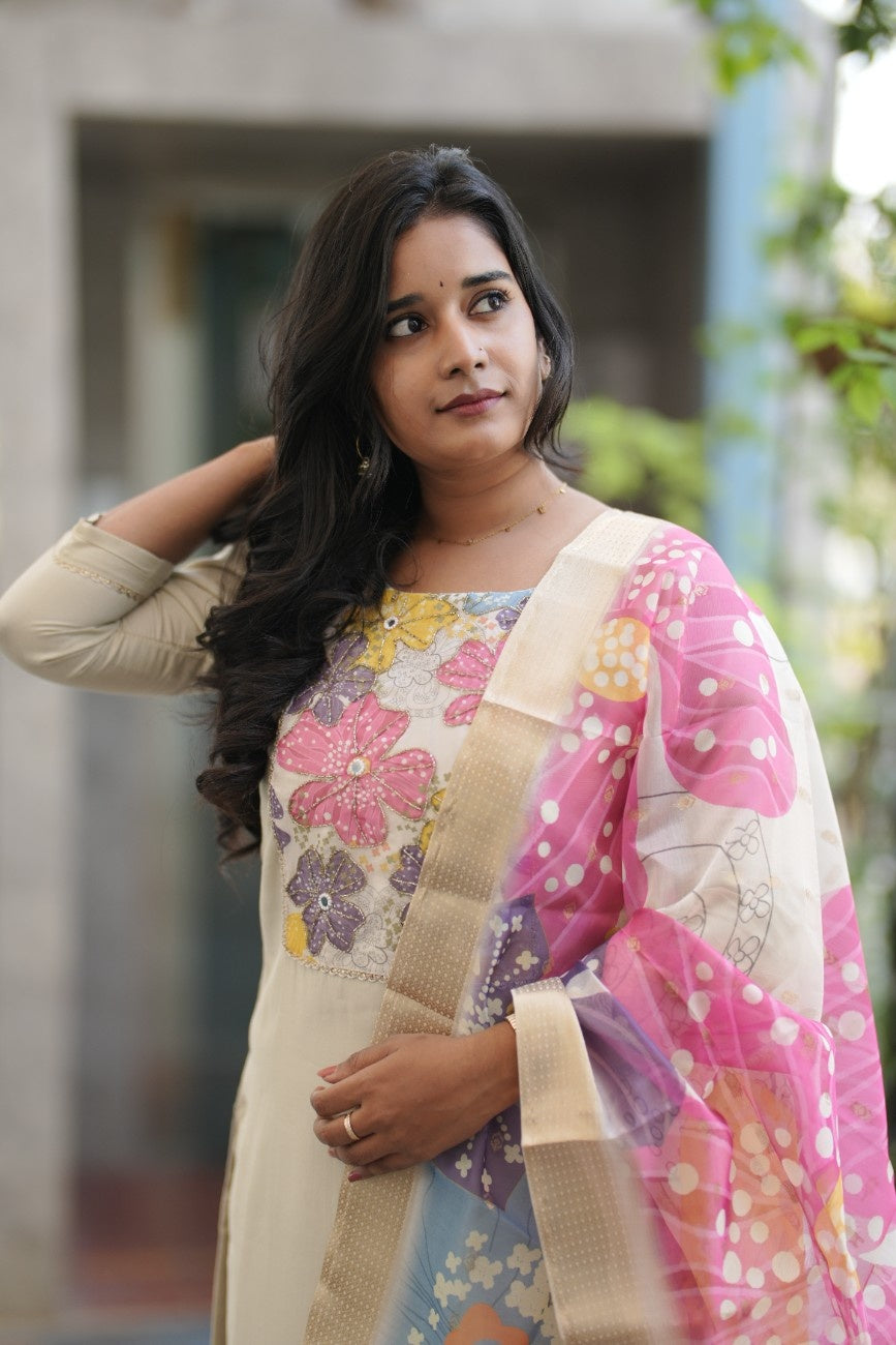 This Roman silk kurti set paired with a delicate organza dupatta offers a perfect balance of elegance and comfort. The Roman silk brings a subtle sheen and smooth drape, while the lightweight organza dupatta adds a soft, graceful finish.